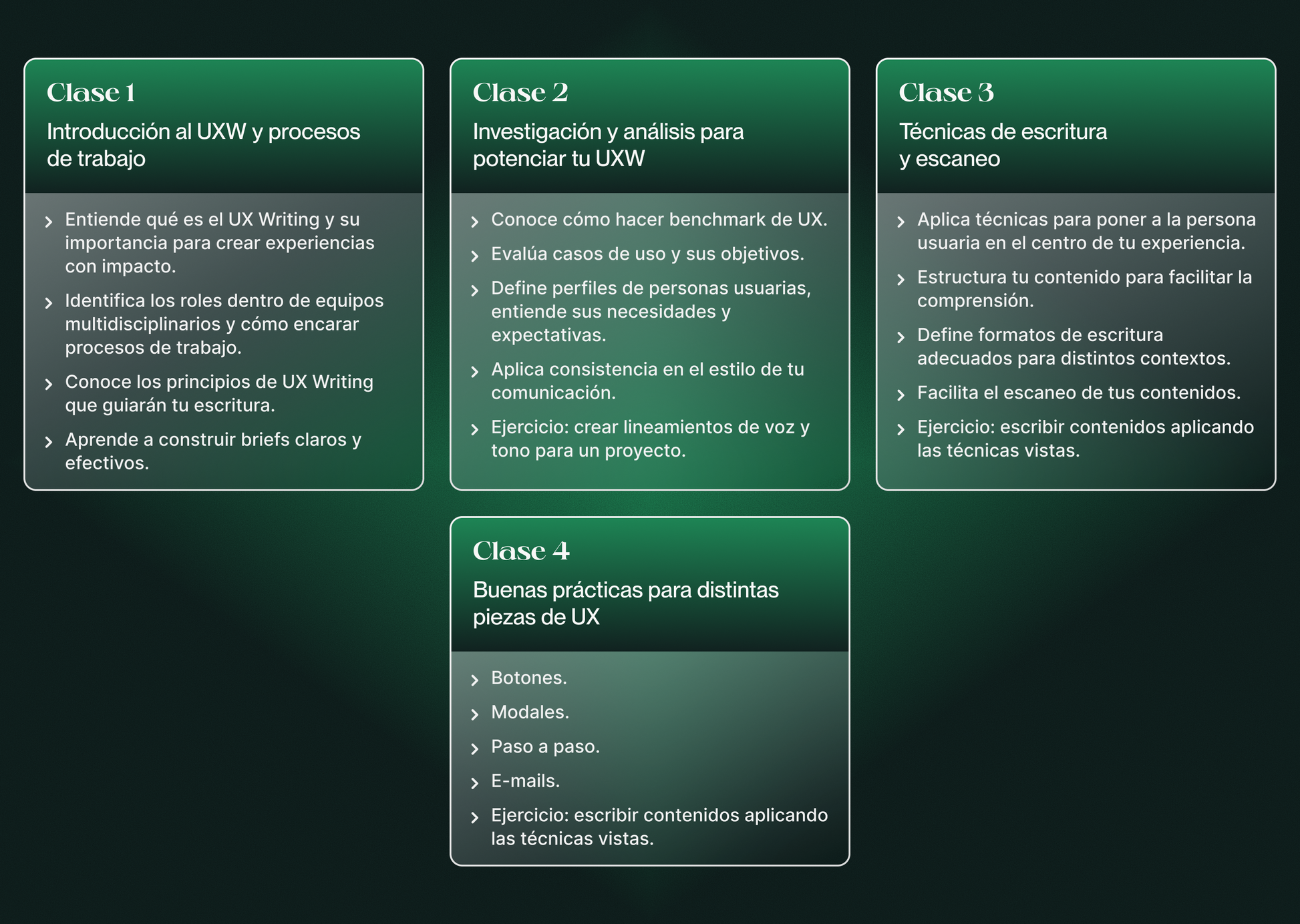 Potencia tus habilidades de escritura y crea una estrategia sólida detrás de cada contenido. Llévate puntos clave del día a día para llevar tu UX Writing al siguiente nivel.